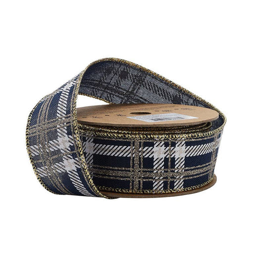 1 1/2" Printed Wired Ribbon | Plaid Blue/White/Gold | 10 Yrd