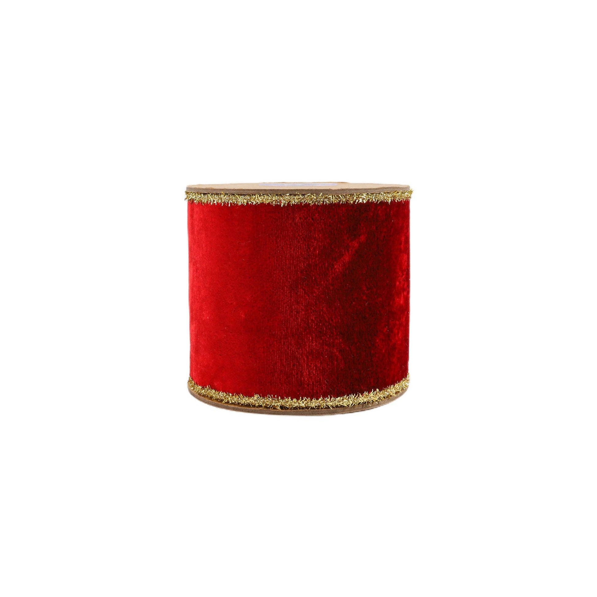 4" Wired Velvet Ribbon | Red w/ Gold Tinsel Edge & Metallic Gold Backing | 5 Yard Roll.