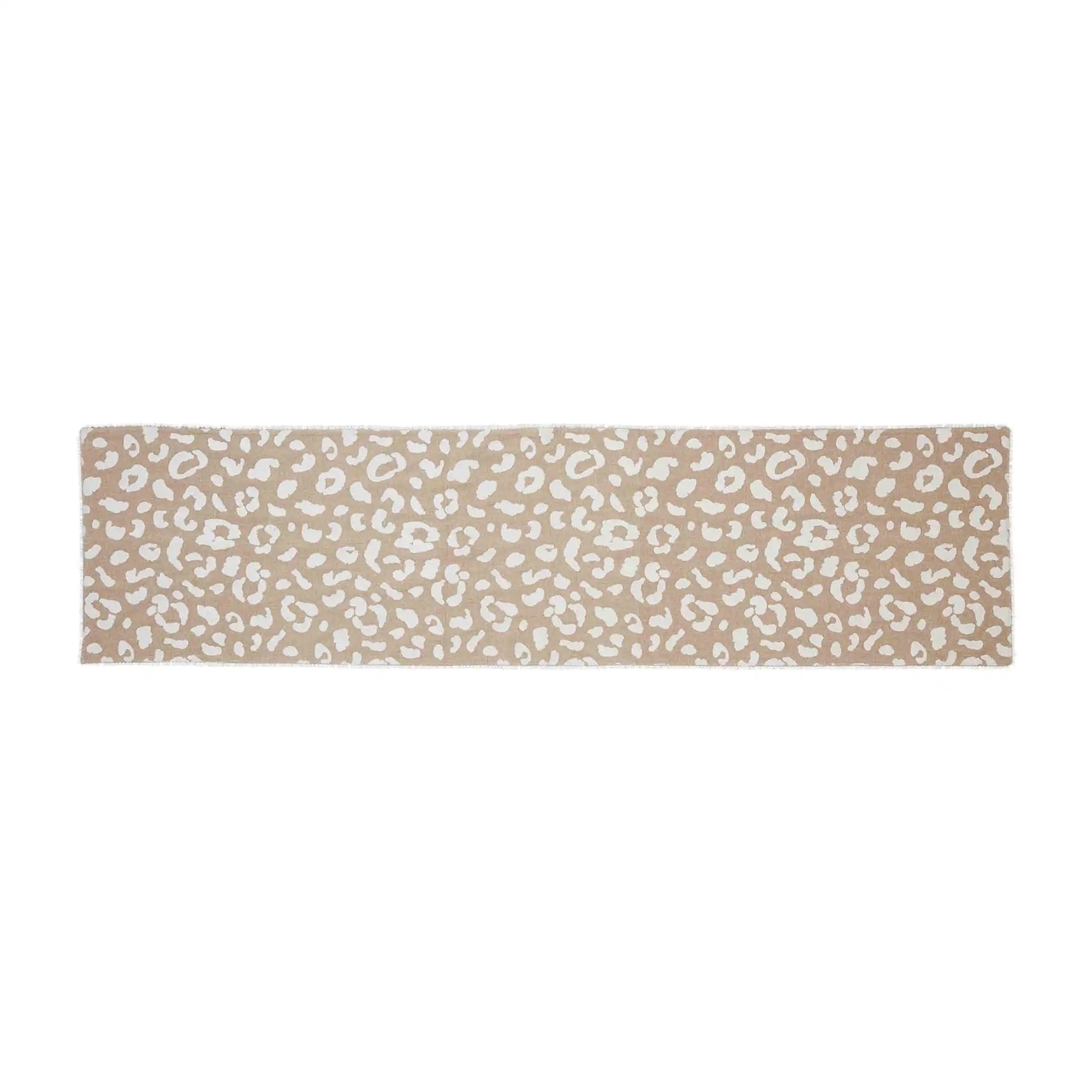 Create the most warming environment for your dinner guests with our Leopard Pom Table Runner. The chambray table runner features a mini pom trim. This table runner is a neutral yet stunning piece. The table runner features a tan and white leopard print pattern throughout.