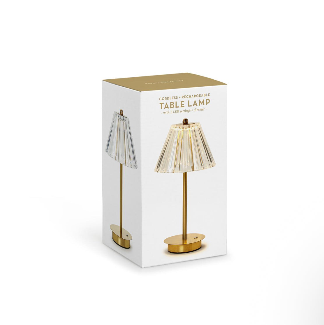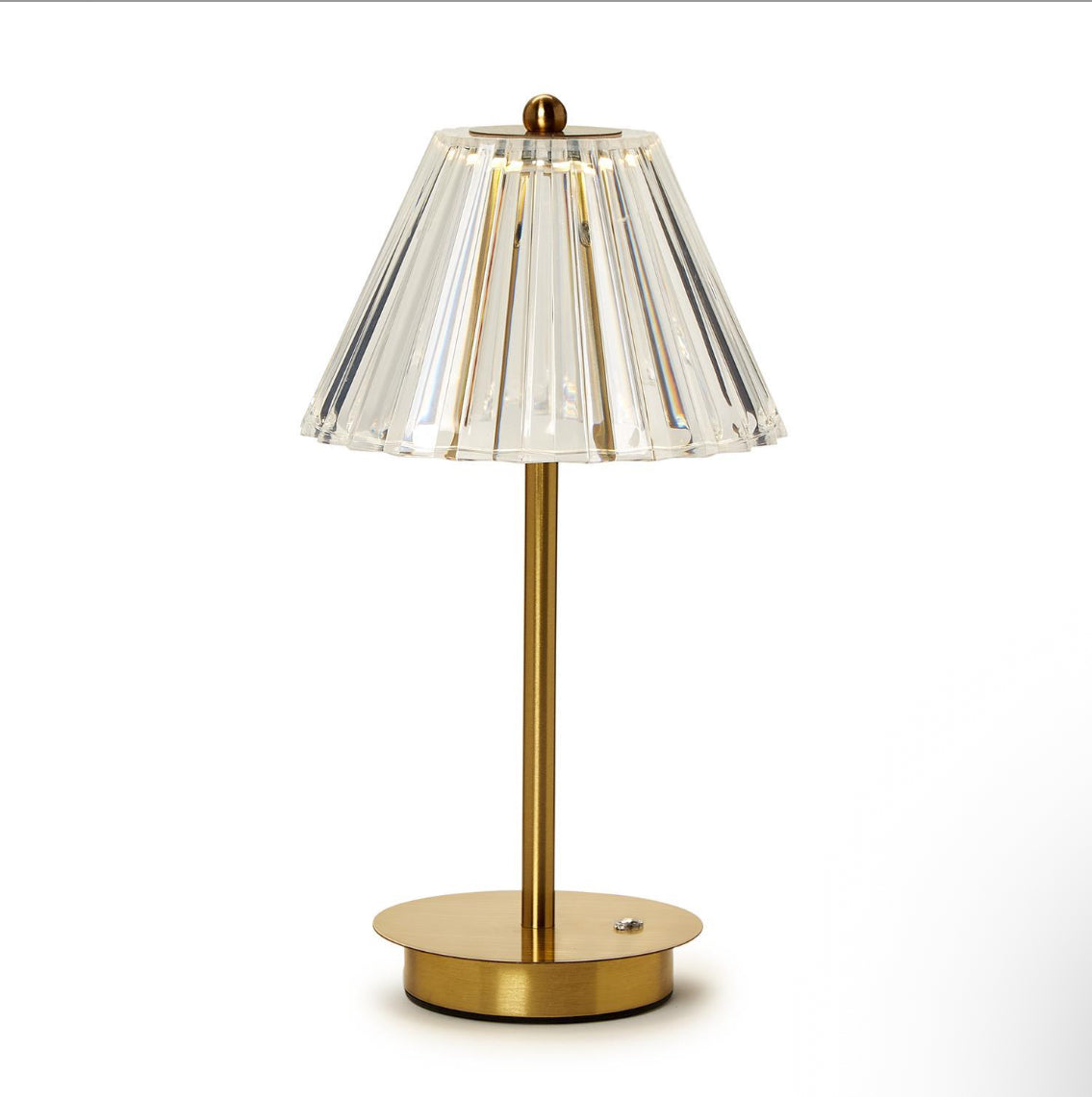 With an elegant clear acrylic shade and gold base, this LED lamp provides cordless light at the touch of a button. Once charged via the included USB cable, the lamp can be used anywhere and includes three light settings and a dimmer function.