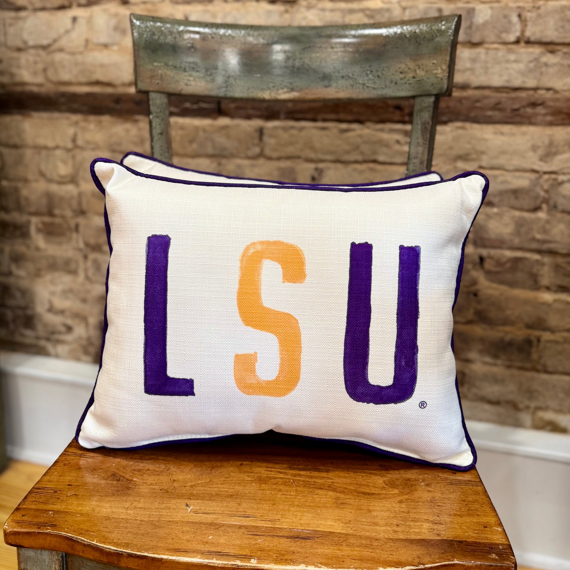 Show your school spirit with a CLC Licensed Collegiate Collection! Designed and manufactured in Calhoun City, Mississippi, Little Birdie pillows are the perfect way to cozy up any space! All of these pillows are made from a soft yet durable polyester fabric, and arrive stuffed with poly-fill and sewn shut. The designs are dyed directly into the fabric, so they won't peel or crack. Square pillows measure approximately 17 x 17" and lumbar pillows are approximately 20 x 14." Add colored piping to any pillow to give it an extra pop! Pillows are machine washable (Cold water, Delicate Cycle- Fluff, and Air Dry Flat).