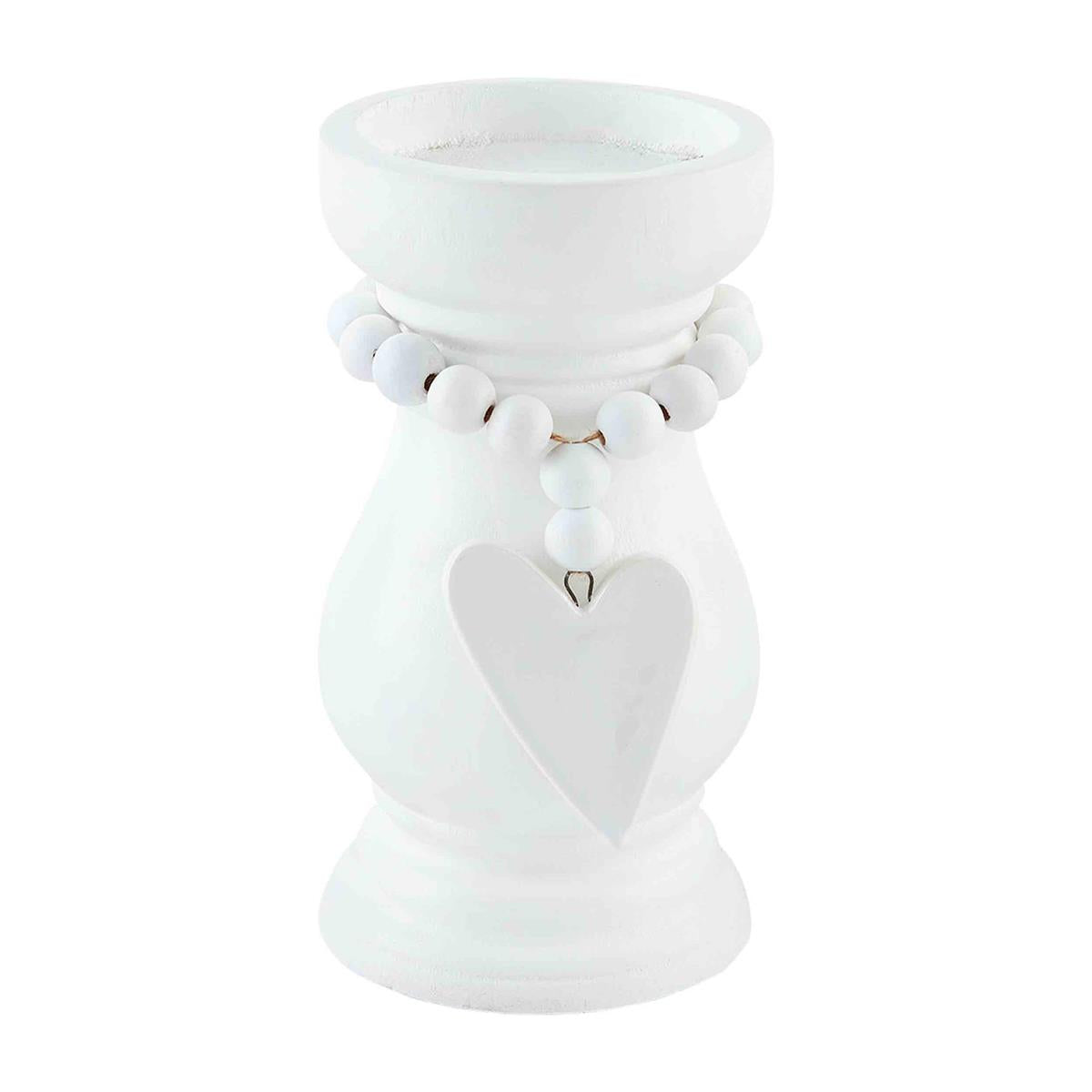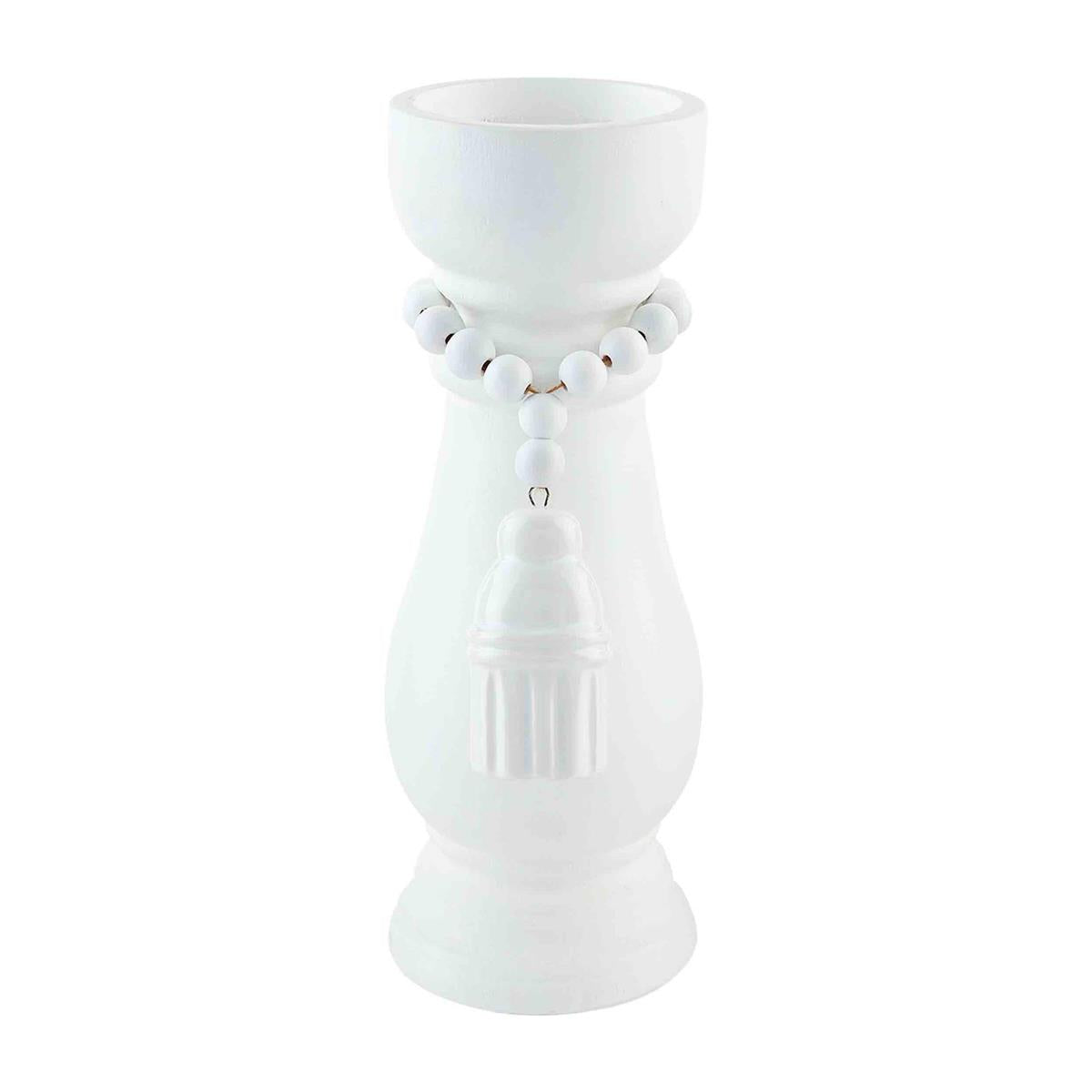White-washed paulownia wood candlestick features draped wood beads with ceramic pendant.