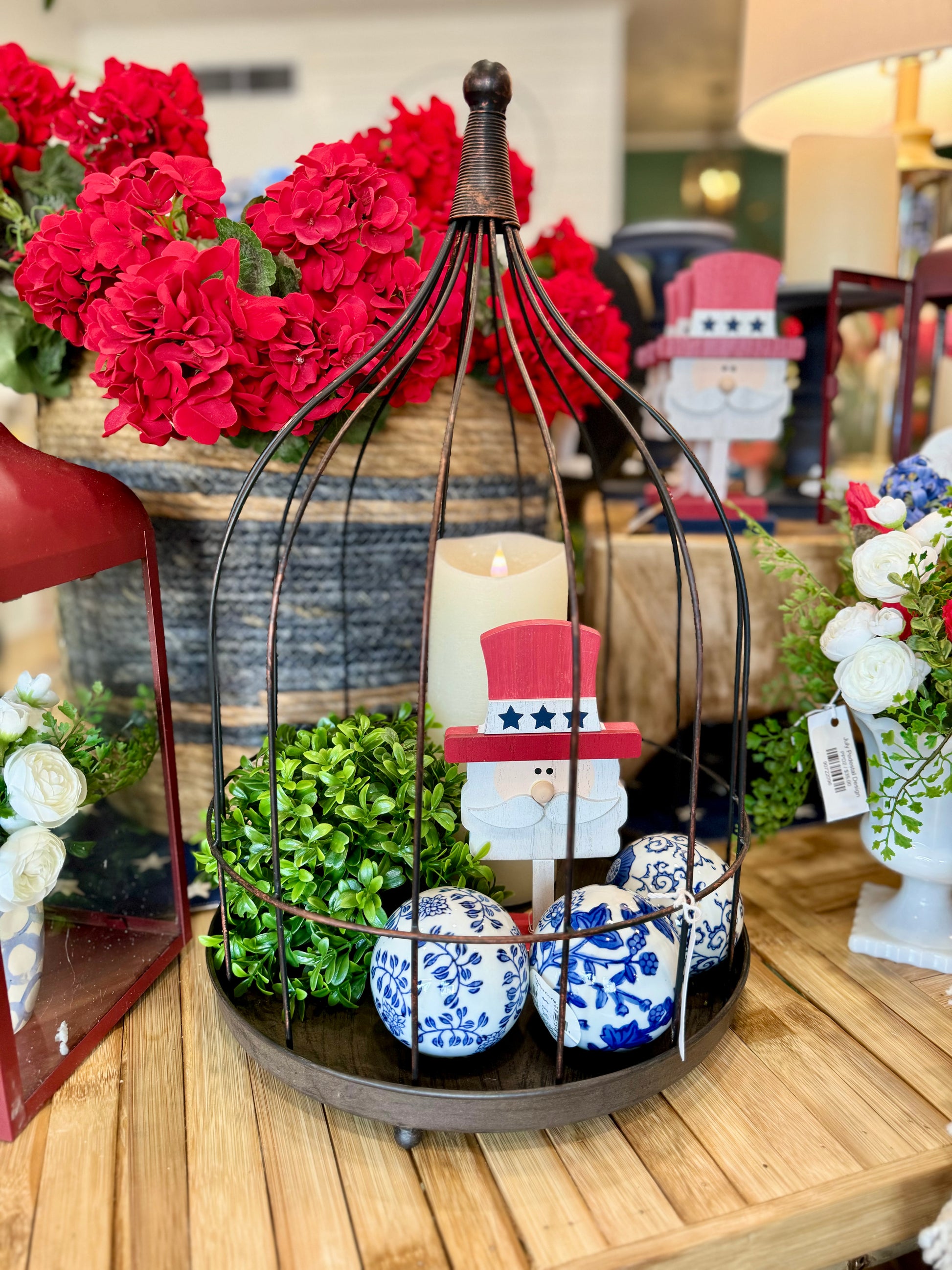 Uncle Sam Cutout with Tan Face, Black Painted Eyes, 3D White Washed Wood Mustache, Red Washed Wood Hat, White Washed Wood Layer, Blue Painted Stars, on Red and Blue Washed Wood Base.