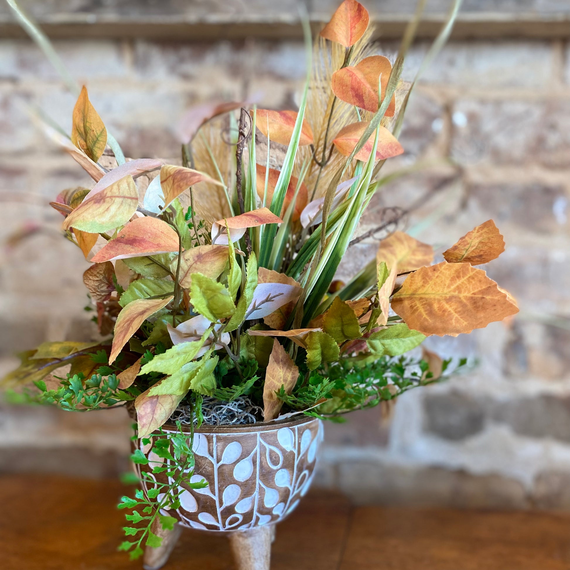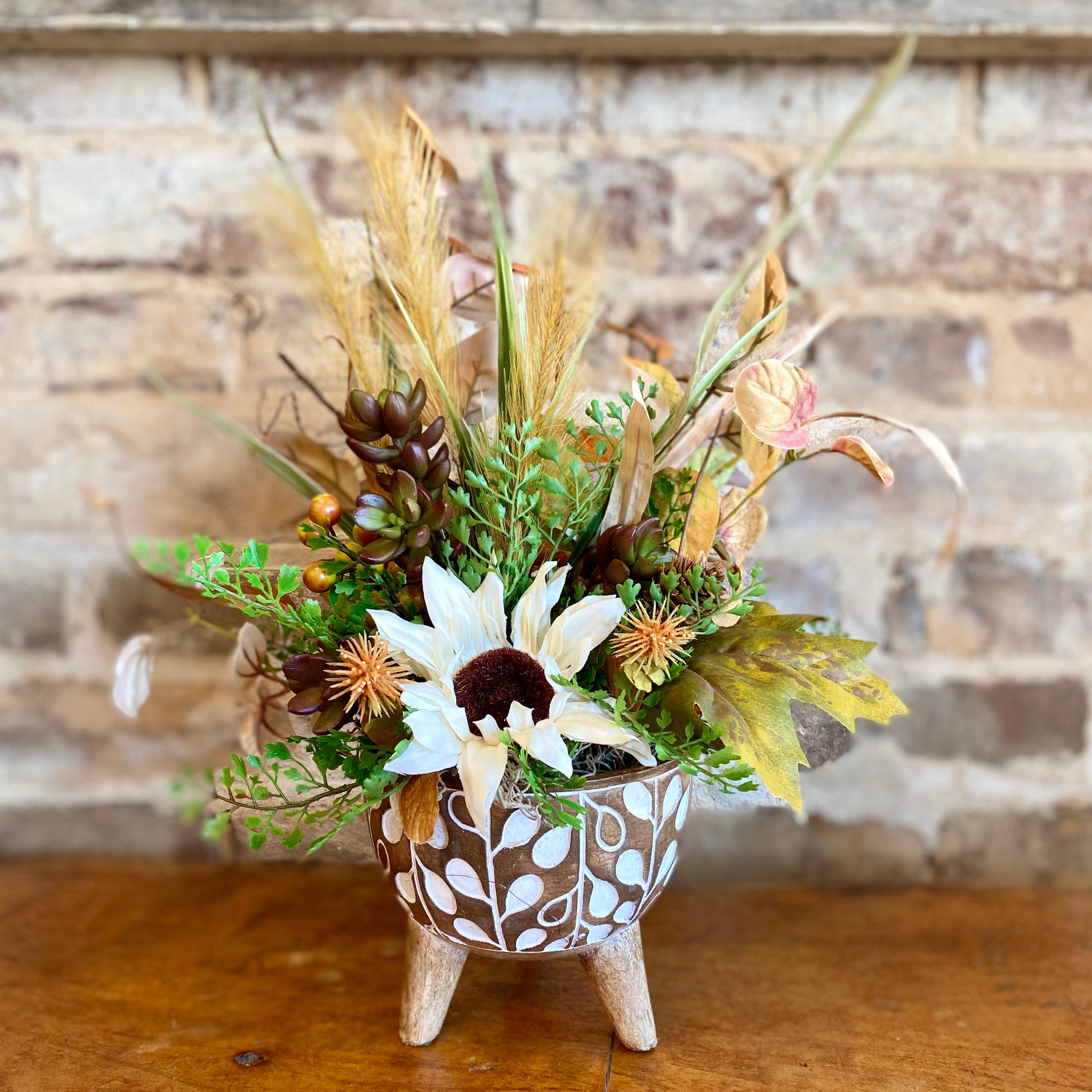 Our designs are created with high quality stems and your satisfaction in mind. This resign tripod planter is made up of mixed foliages, sunflower, succulents and pampas grass.