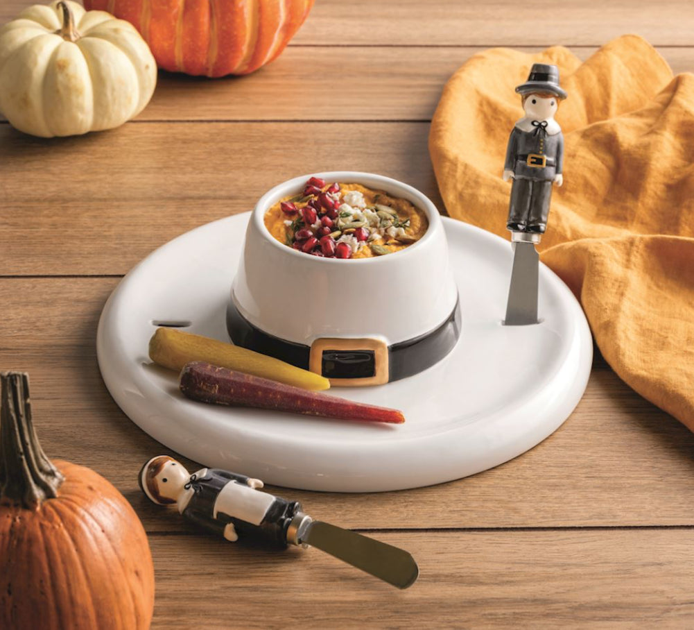 3-piece set. Hand-painted ceramic pilgrim hat serving pedestal features two slits to hold pilgrim spreaders in place. Flip server over and repurpose as chip and dip dish.
