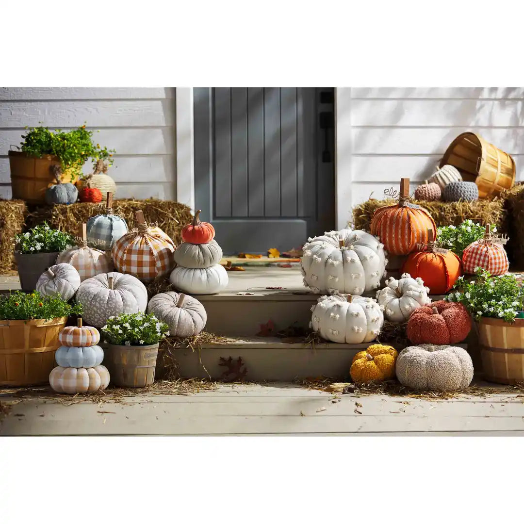 Welcome the enchanting Fall season with our exquisite Velvet Stacked Pumpkins. These plush, stuffed pumpkins are the perfect addition to adorn your fireplace, creating a cozy and inviting atmosphere. Crafted with a luxurious 100% cotton shell and filled with high-quality polyester, these pumpkins offer both elegance and durability. To keep them in pristine condition, spot cleaning is recommended. With a height of 15 inches, this captivating pumpkin stack becomes an eye-catching centerpiece in any space. Each pumpkin showcases a unique diameter, adding depth and charm. The largest pumpkin boasts an impressive 11 inches in diameter, while the medium and smallest pumpkins measure 9 1/2 inches and 6 1/2 inches in diameter, respectively.